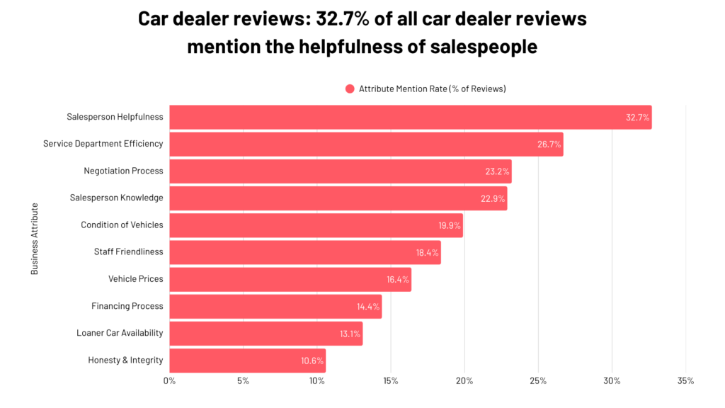 • Salesperson helpfulness is a focus in 32.7% of all car dealer reviews.