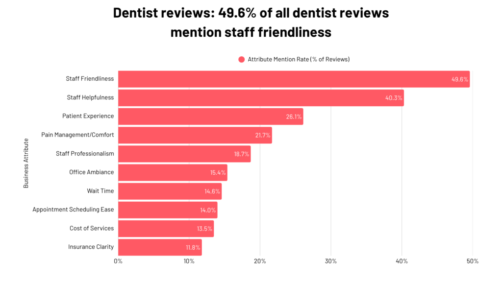 • Nearly half (49.6%) of dentist reviews mention staff friendliness.