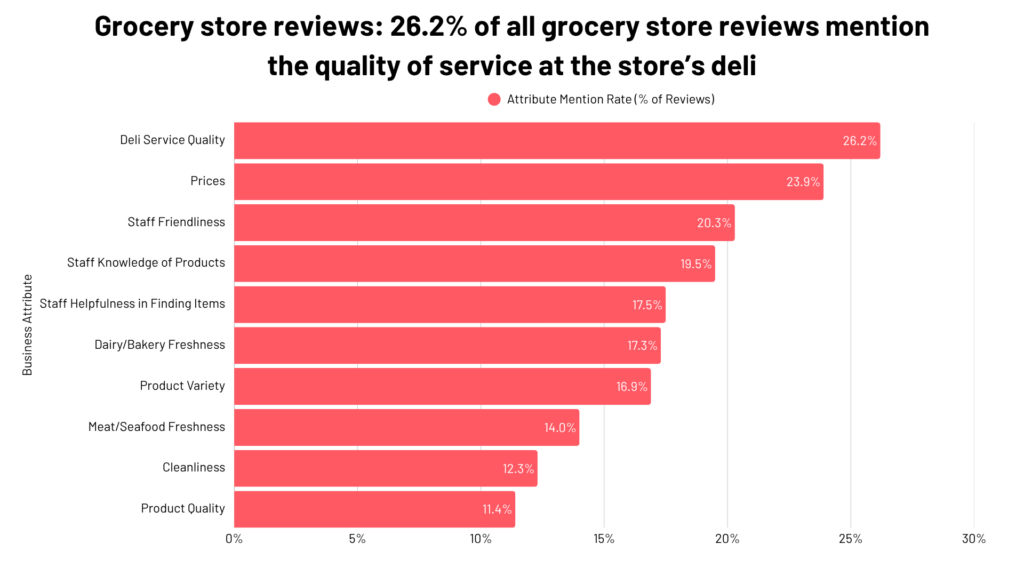 26.2% of all grocery store reviews mention the quality of service at the store’s deli.