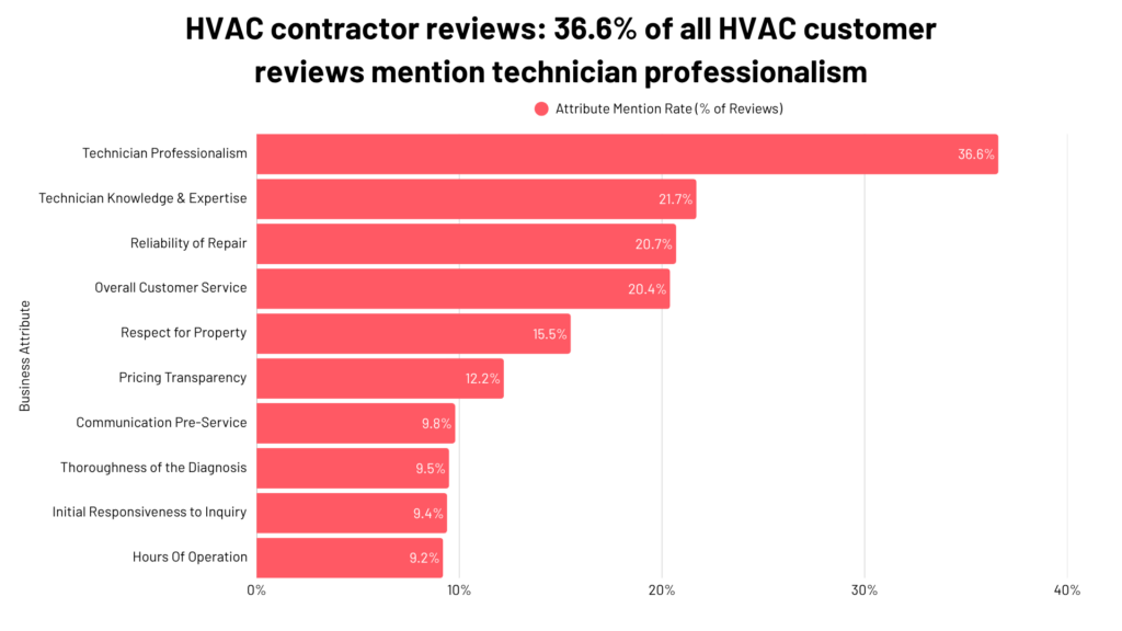 About 1 in 5 HVAC customer reviews mention each of the following attributes: technician knowledge and expertise, work reliability, and overall customer service. While some reviews mention more than one of these, these factors consistently stand out to customers.