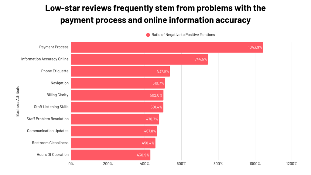 Below are the top 10 attributes most mentioned in 1-star reviews, ranked by how much more frequently they appear in 1-star reviews compared to 5-star reviews. For example, a “1043.9%” ratio means payment process is mentioned about 10x more often in a 1-star review than in a 5-star review.