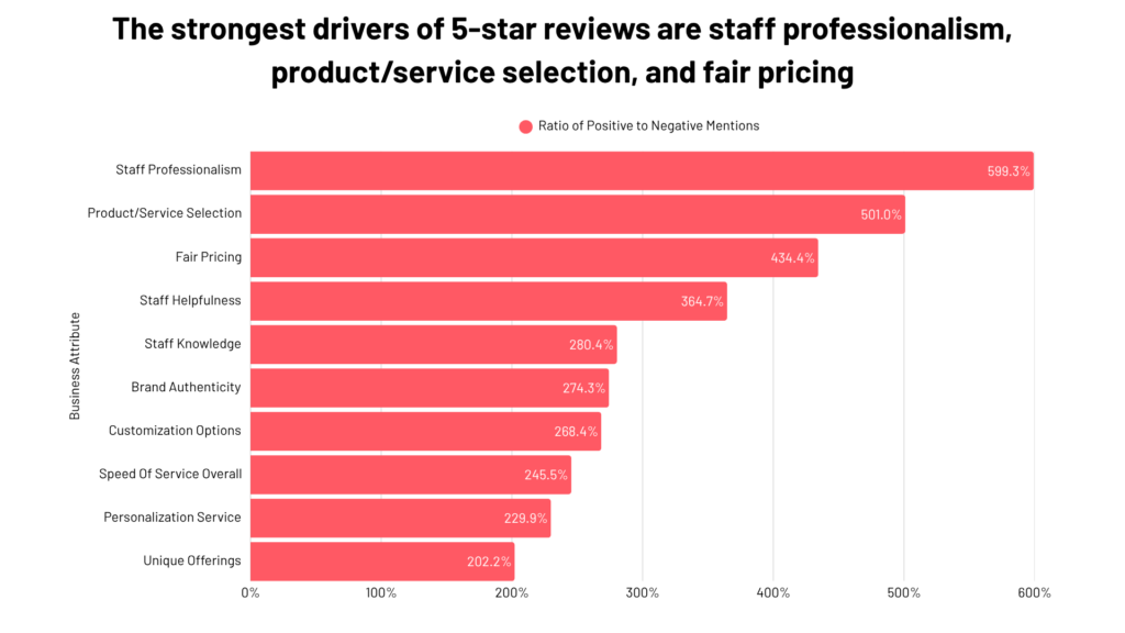 The strongest drivers of 5-star reviews are staff professionalism, product/service selection, and fair pricing